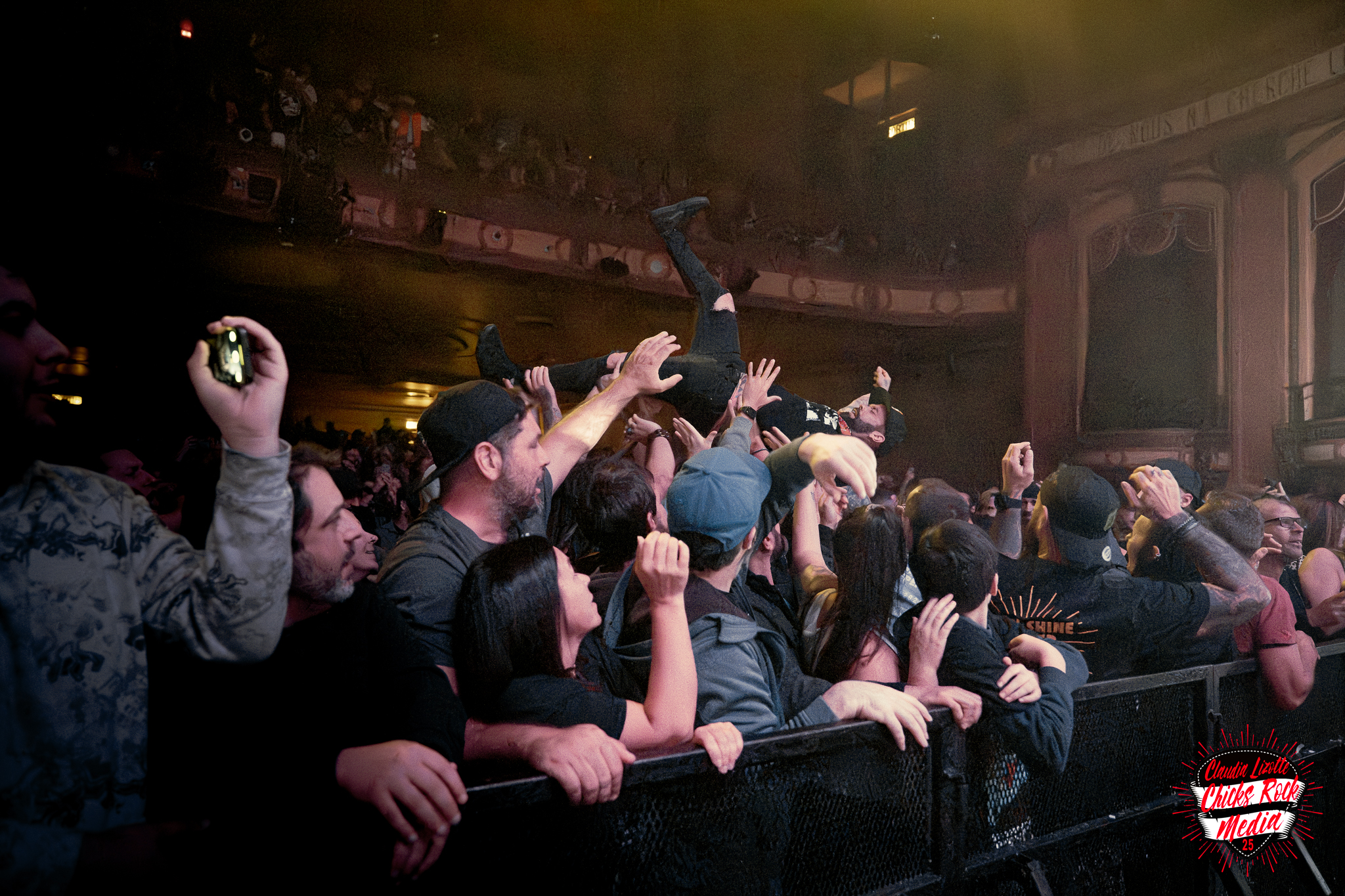 Pendant une des chansons, le guitariste passe à la basse pour permettre à Mike d’aller chanter près de la foule. Les crowd surfers se multiplient et sont au rendez-vous pour ce moment; l’énergie est à son comble.