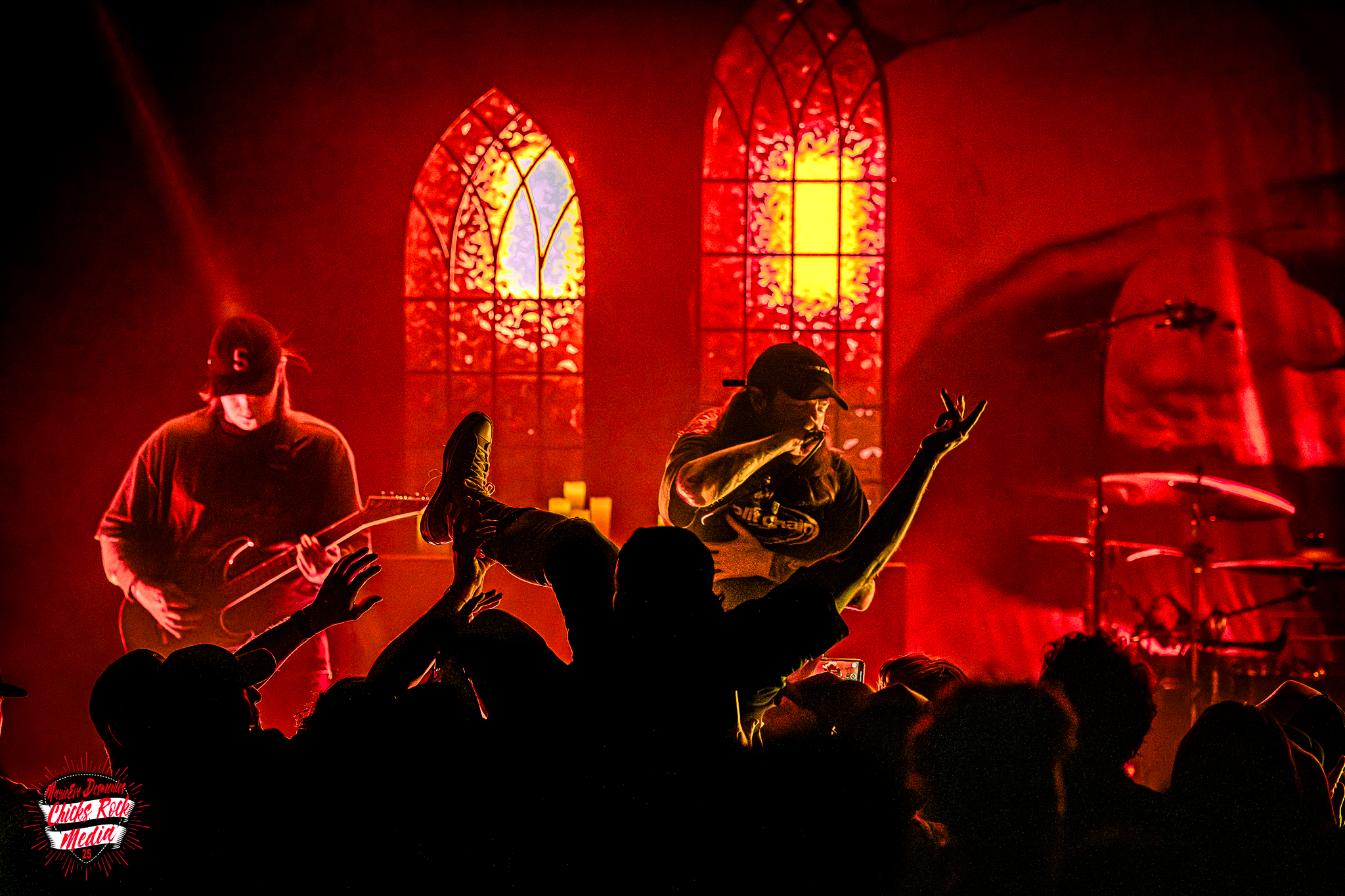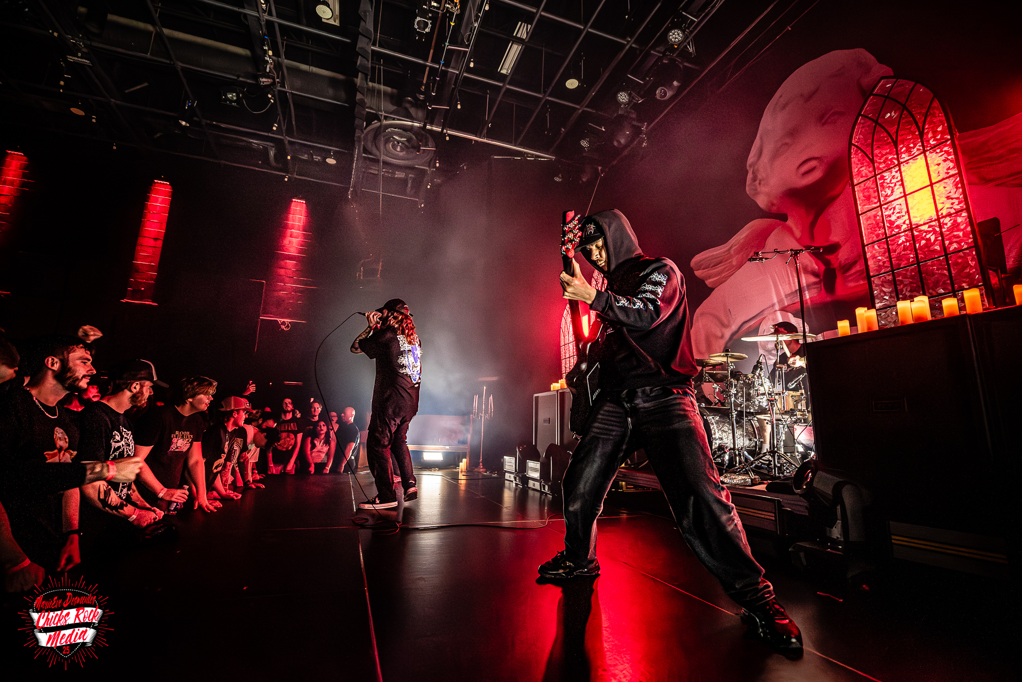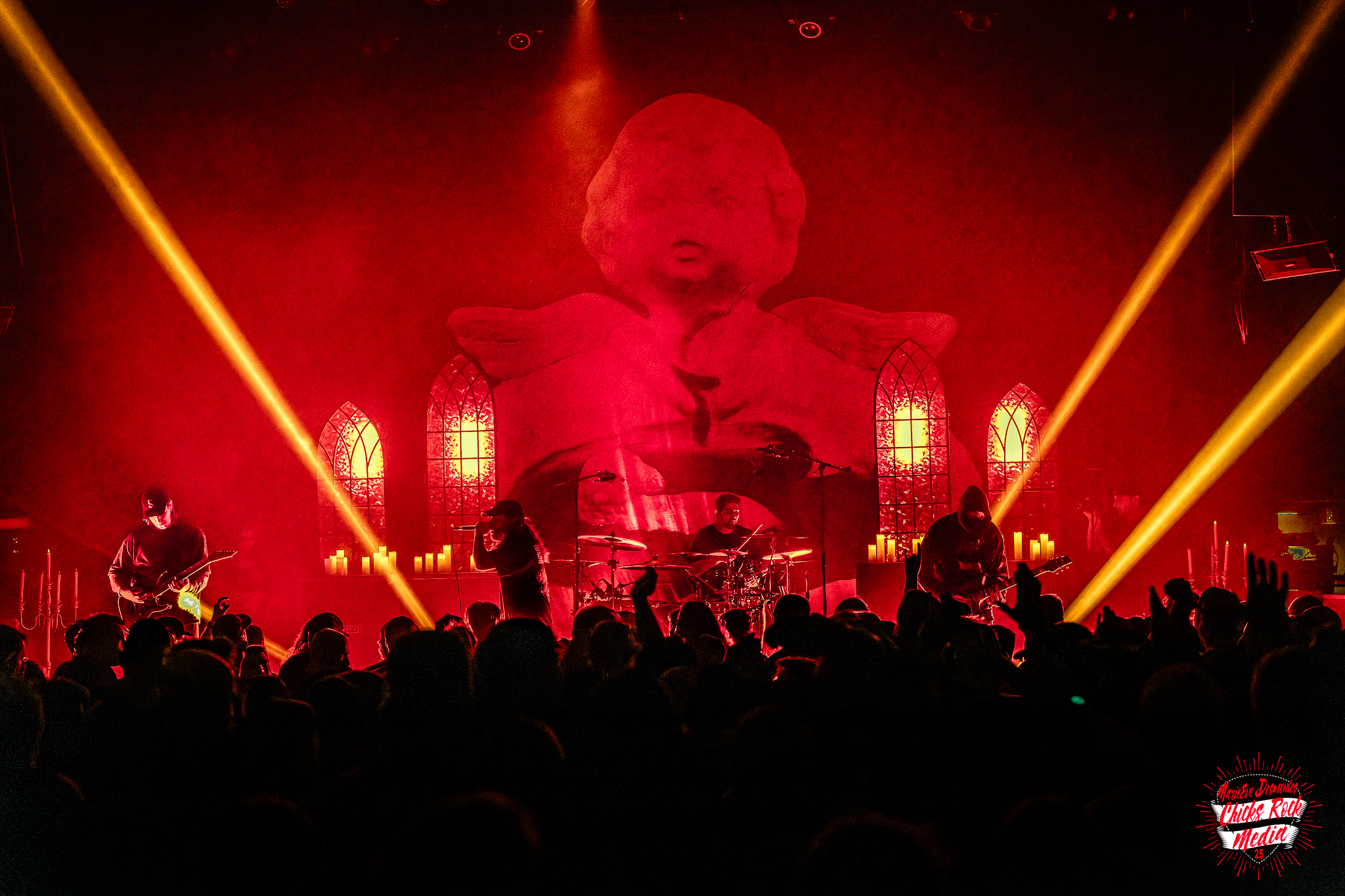 Founded all the way back in 2007, COUNTERPARTS wore two other names before landing on this ultimate one in 2008, inspired by a track from ALEXISONFIRE. Over their prolific career, they shifted from purer hardcore punk bases to melodic hardcore, then into a more metalized / metalcore sound since their 2022 full length A Eulogy For Those Still Here. This here tour was based on their absolute banger of an EP Heaven Let Them Die from 2024. As such, we were neck deep in themes of religious deconstruction and church imagery. As a backdrop, a classic cherub, its throat cut, bleeding profusely into a chalice, in the basin of which drowned a pure-white lamb, stained in the holy blood. On each side of the stage, Gothic-inspired stained glass windows, textured glass panels behind which large rectangle lights shone in rotating hues. Reds and white were the focus colorway of course, to tie back to the album cover. Around each musicians, tables covered in candles, innumerable burning wax pillars calling back to a church’s altar. The visual message the decor sent was clear: trapped between the cultural reach of the church and its implied, expected worship, we are but lambs brought to the slaughter by an institution that continually betrays and sacrifices us, and we are exhausted, our innocence bled dry. A COUNTERPARTS show is was the purge we so deeply needed.