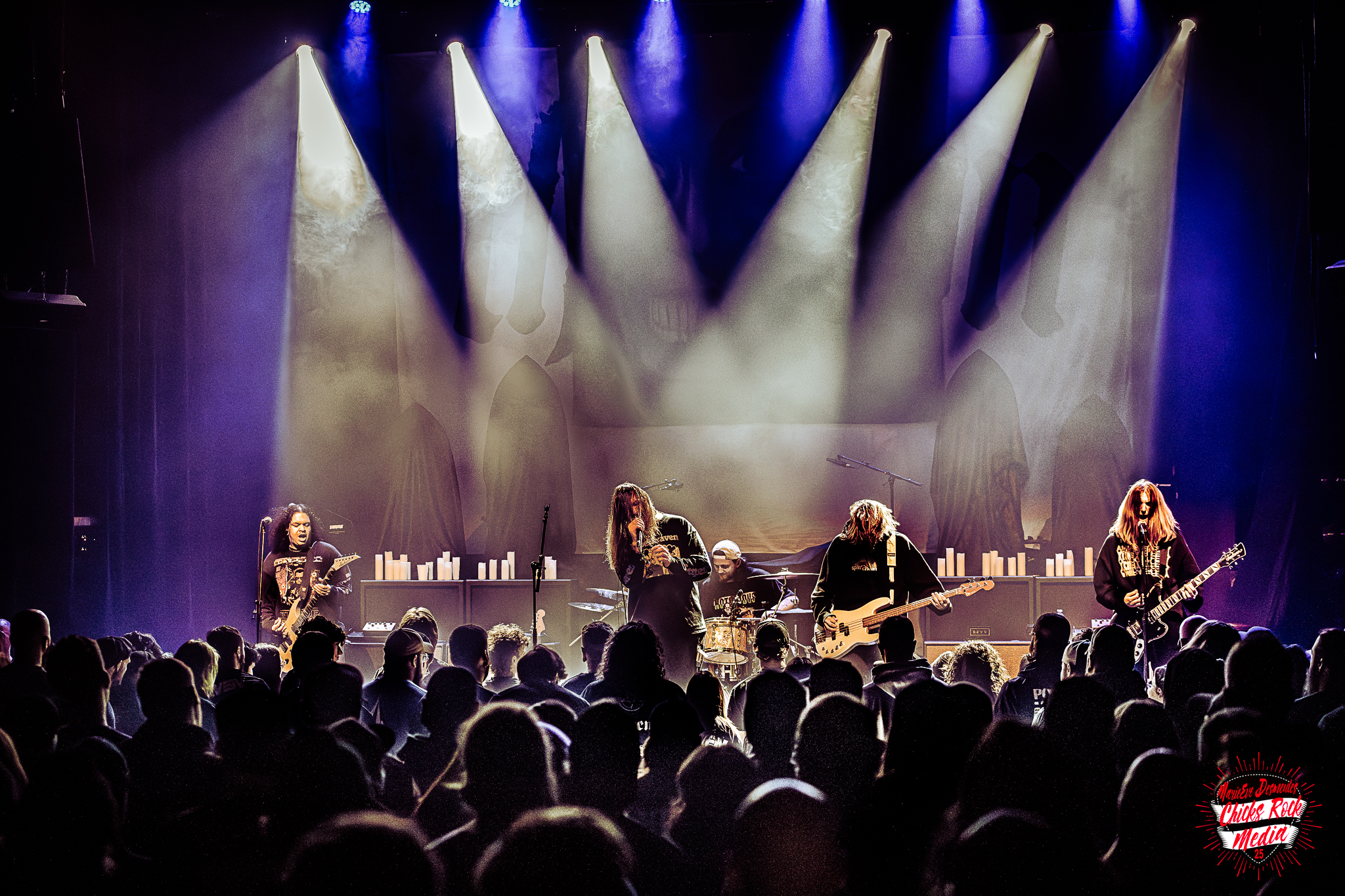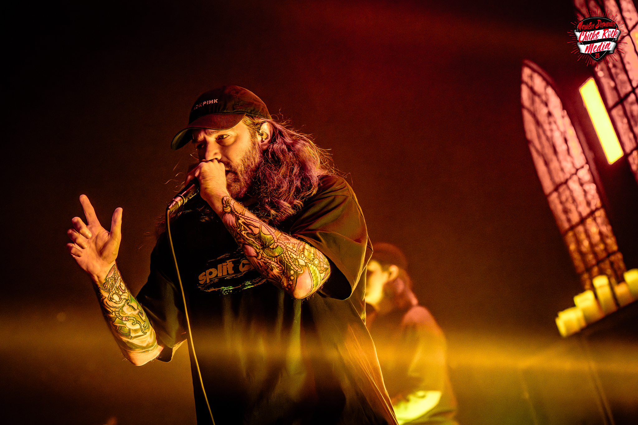 Formé en 2007, le groupe a revêtu deux autres noms avant d’atterrir sur COUNTERPARTS en 2008, inspiré d’une chanson d’ALEXISONFIRE. Au cours de leur prolifique carrière, ils sont passés d’un pur hardcore à un hardcore mélodique, et résident maintenant dans la portion métallisée / metalcore de leur discographie depuis leur album de 2022, A Eulogy For Those Still Here. La présente tournée est basée sur leur EP de 2024 : Heaven Let Them Die. Nous sommes donc ancrés dans l’imagerie gothique et la déconstruction religieuse. La toile de fond de scène dépeint un chérubin classique, gorge coupée, le sang récolté dans un calice dans lequel se noie un agneau blanc. Sur la scène, des fenêtres d’inspiration gothique rappelant les vitraux d’église, une large lumière derrière chaque pan de vitre texturé qui change de couleur selon le morceau joué, préconisant le rouge et le blanc de la couverture d’album. Autour des musiciens, une myriade de chandelles allumées rappelant des cierges votifs.
