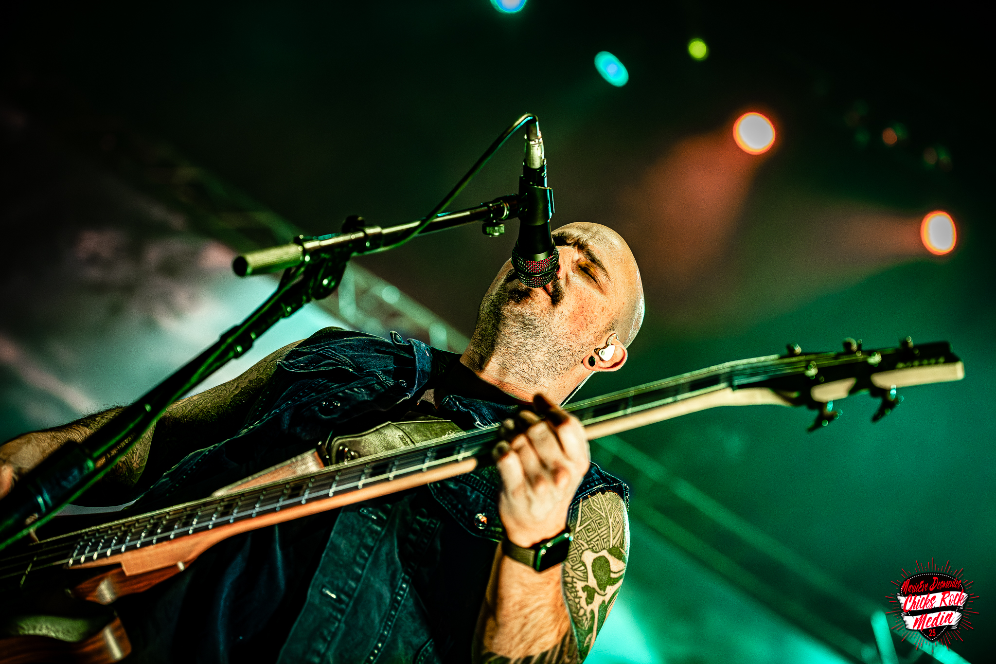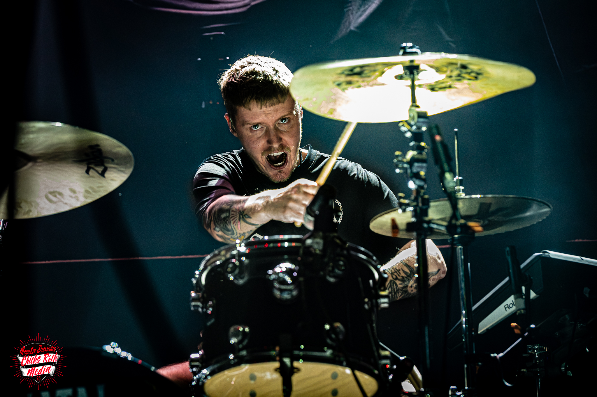 Visually, TRIVIUM chose to go the old-school cool route, and it worked to their advantage. They knew what their people wanted from them, and that was to relive key life moments through nostalgia and jumping inside an early 2000s time capsule. So, they didn’t have screens, nor anything electronic. Just good old fashion spotlights and flags. Every element on stage was visual art and practical effects: amp walls decorated with a cartoon-spooky graveyard scene, gargoyle statues with red LED eyes, a makeshift chain-link fence caging the drum platform. Alex Rüdinger, TRIVIUM’s newest recruit, throned behind his kit in the center of this Halloween-esque scene, before a large backdrop that completed the cemetery tableau.