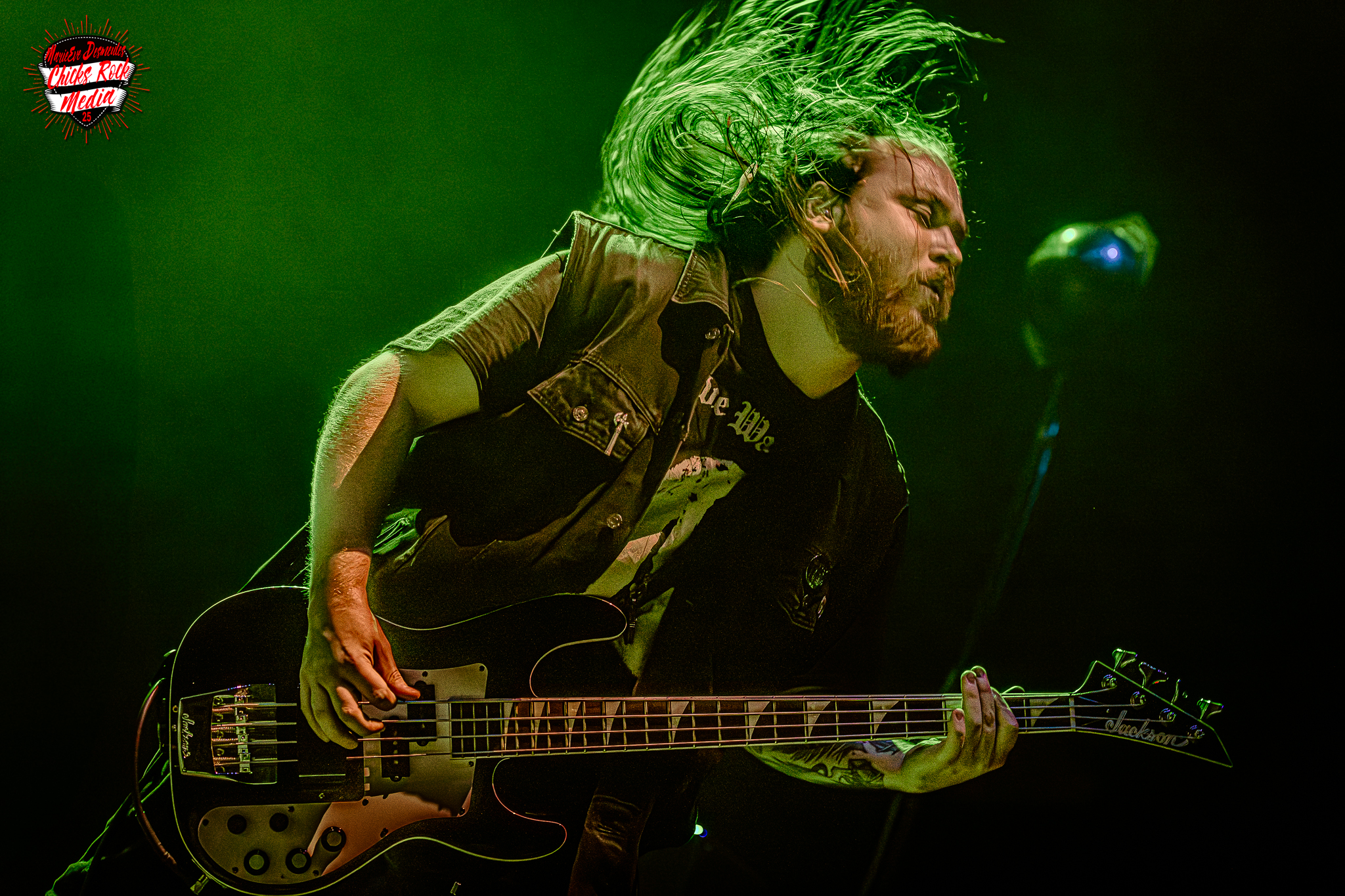 Foul Void and Siege Lord kicked things off in front of a venue filled maybe a third of the way, but more attendees trickled in as they played. Debbie Gough on vocals and guitar immediately caught my eye. Long fluffy blond hair, shiny metallic green dress shirt, fluorescent-yellow axe, and one of those voices from beyond the grave. Yeah, she was special. She bossed the crowd around like nobody’s business, both in between and during songs. “Show me your fucking horns!”, “Make some fucking noise Québec!”, “I wanna see a circle pit right now, move!!”. With all of it in English; combined with her thick accent and the fry distortion on her voice, not every instruction landed, the crowd remaining mostly politely motionless. We did chant “hey hey hey”s on beat and clapped our hands whenever we could, and the further the concert went, the more the floor filled up. Gough headbanged with her whole body, bending at the waist, hair choreography on point. Her singing was raspy, abrasive, worn-out in a great way; a sort of sand paper texture on her voice, which gave it a distinctive texture among the modern metalcore realm.