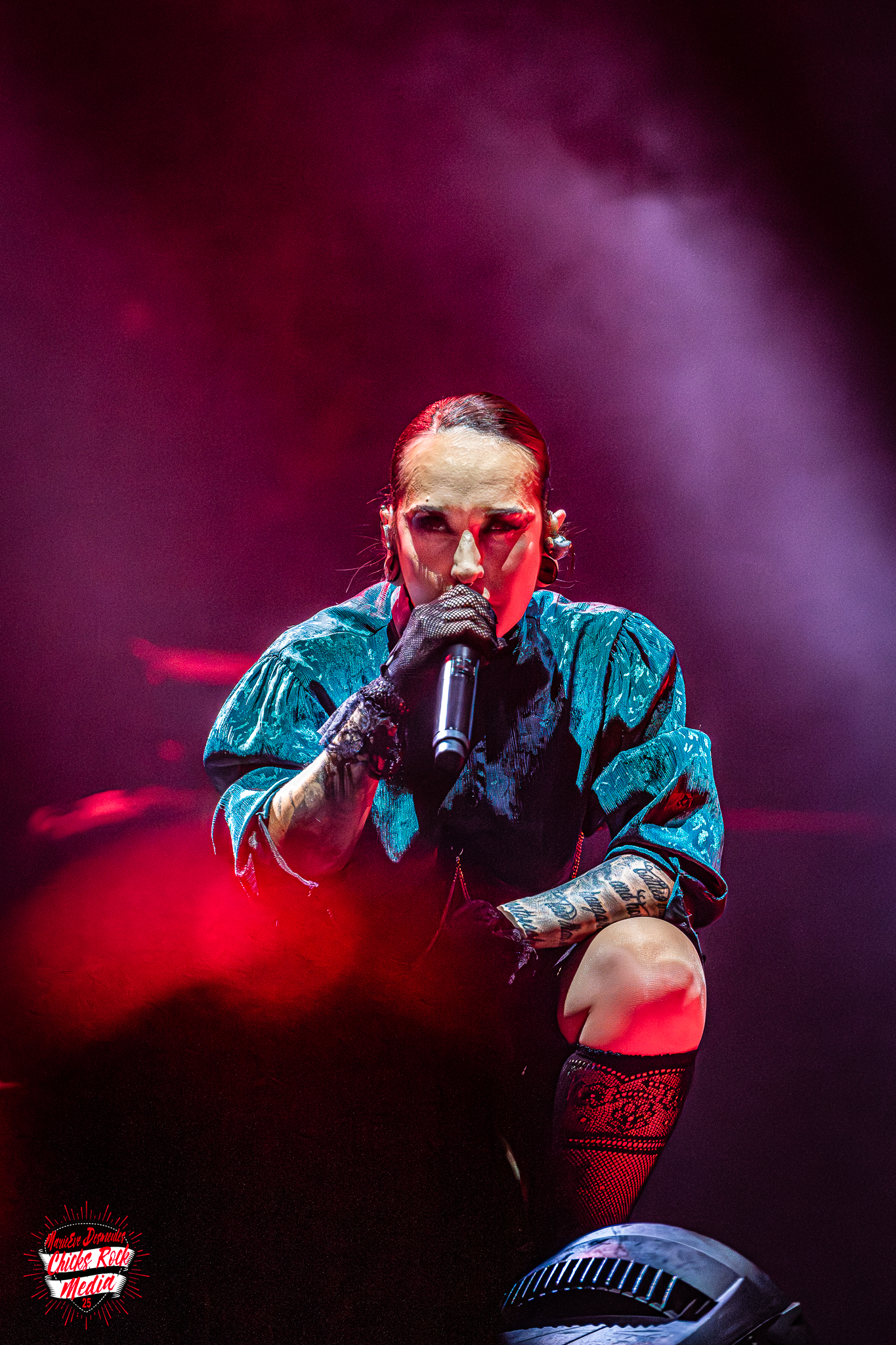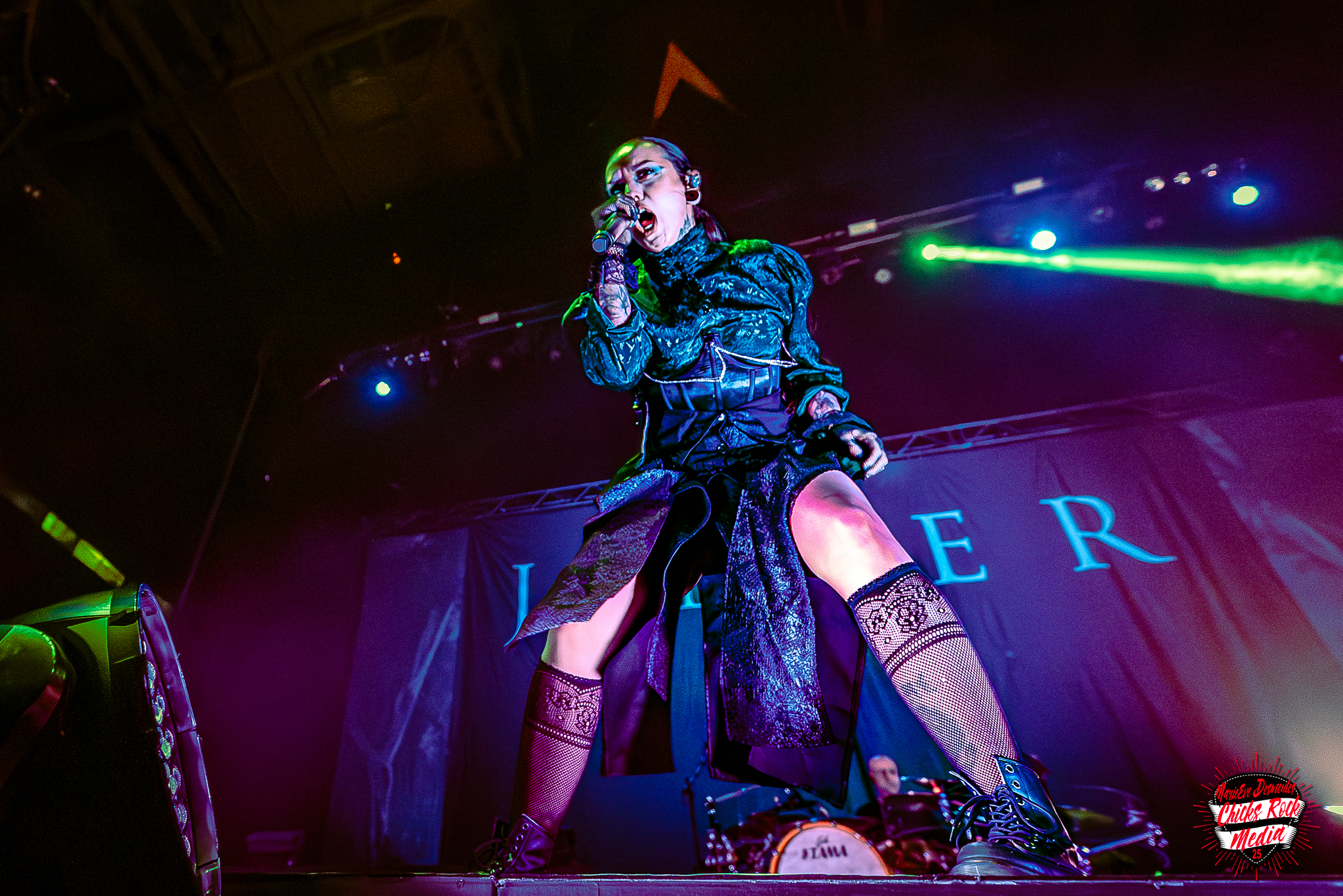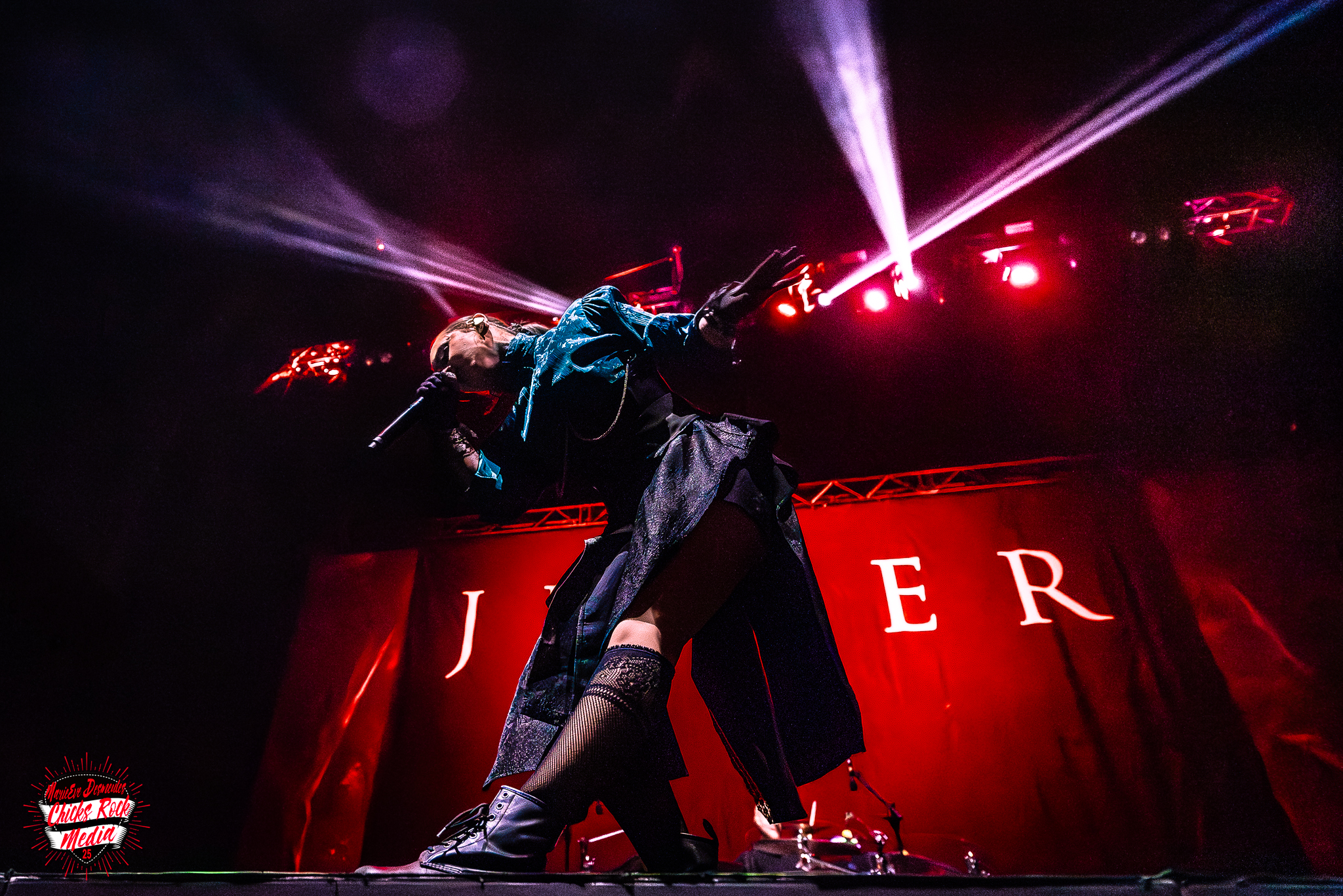 Tatiana was quite the character, based on a stark dichotomy. On one end, we had the beauty side: gorgeous, ethereal, damn-near seraphic clean vocals, beckoning us like a siren. She danced, sinuous and serpentine motions, fluid feminine grace down to her fingertips. The velvet dress, the corset, the delicate lace gloves, the glittery makeup, everything was there. When she spoke to the crowd between songs, she did it with a shy, luminous, mirthful tone: “Goodnight Québec! Wow there’s a lot of you in here! It’s cold up here too, are you cold? Well poor some warm wine in your cup with me, this is Green Serpent.” She was radiant. On the other side of the coin, we had the monster: Shmayluk had one of the heaviest, most corrosive screams in the prog game. Those low rumbly gutturals were the key to JINJER’s virality: it was the effect of surprise, how she sounded like a male screaming, that confused the non-initiate and got people talking. In a live setting, Tatiana navigated her contrast perfectly. Her attitude changed too, her whole body language switched according to the vocals. In monster mode, she’d stomp loudly on her raiser with her thick-soled leather boots; she’d jump from it, throw spin kicks around, lurk around the stage, roaming ceaselessly, glaring at the crowd, pinning us in place. A true Jekyll and Hyde.