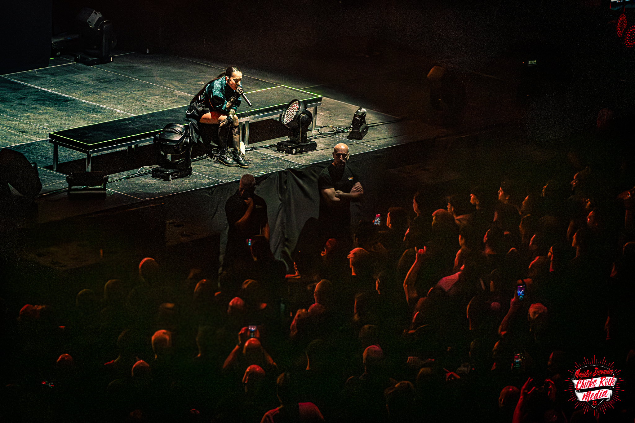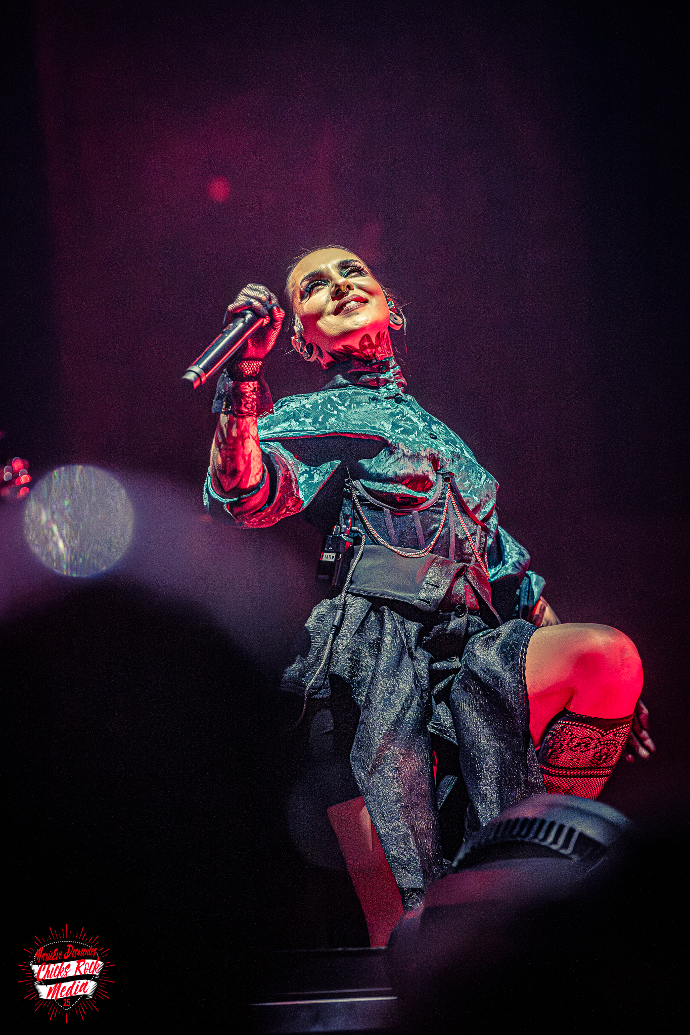 Elle commande la scène à grands coups d’ordres durant les chansons: “Montrez-moi vos putains de cornes!!”, “Faites du fucking bruit Québec!”, “Partez-moi un gros circle pit!”; le tout en anglais uniquement, avec quand même un fort accent et en plus elle ajoute sa distorsion sur sa voix, donc les consignes ne sont pas toutes absorbées. Quand vient le temps de crier en rythme ou de taper des mains par contre, ça, on est réceptif, et au fil des chansons, l’énergie monte autant que le parterre se rempli.