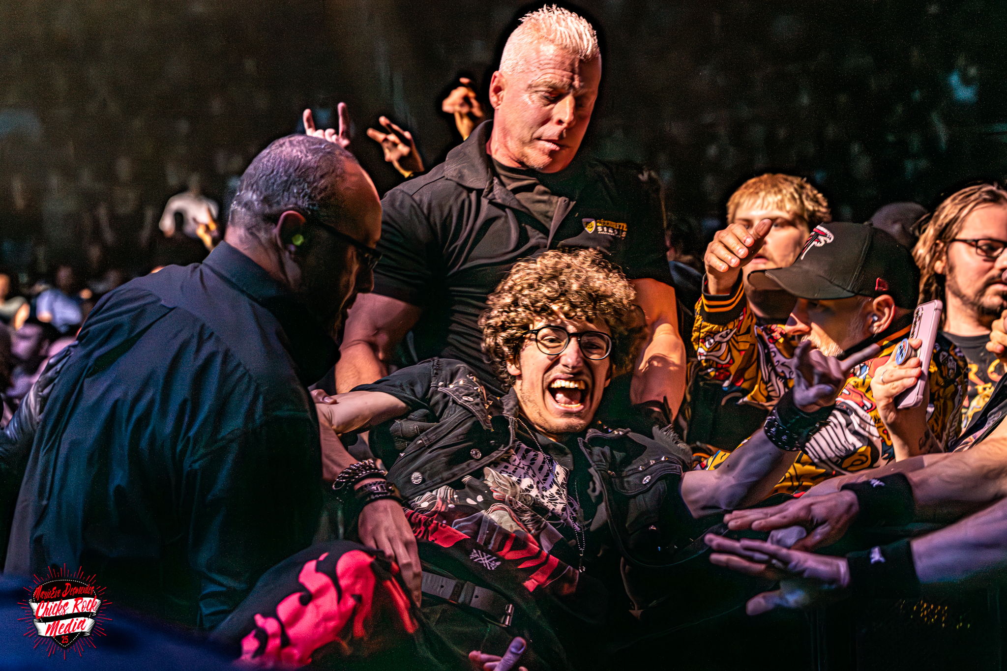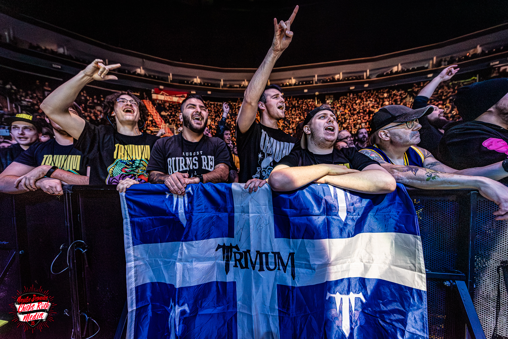 Il est 21:40. Tout le monde est là, un bon 3000 billets d’après-moi. Il est l’heure de la pièce de résistance : les américains de TRIVIUM. Groupe légendaire de heavy métal aux influences métalcore et thrash, le quatuor Floridien roule depuis plus de vingt-cinq ans. Ils se passent d’introduction: ils ont leur son bien campé, ils font leur truc, ils ont leurs fans fidèles qui les suivent depuis dix albums; ils sont plus qu’établis. La foule amassée au CENTRE VIDÉOTRON représente l’allégeance et la loyauté: on voit beaucoup de têtes blanches, de parents avec leurs enfants ou jeunes ados qu’ils initient à leur musique. C’est une moyenne d’âge plus élevée que les “shows” de métal habituels. Ce sont des amateurs dévoués mur à mur, qui suivent le band depuis deux décennies et qui en connaissent les moindres recoins.