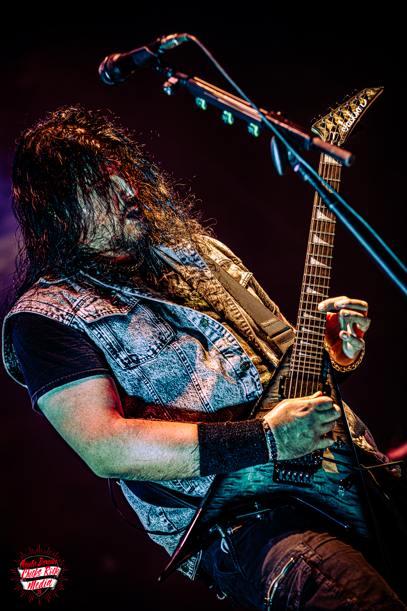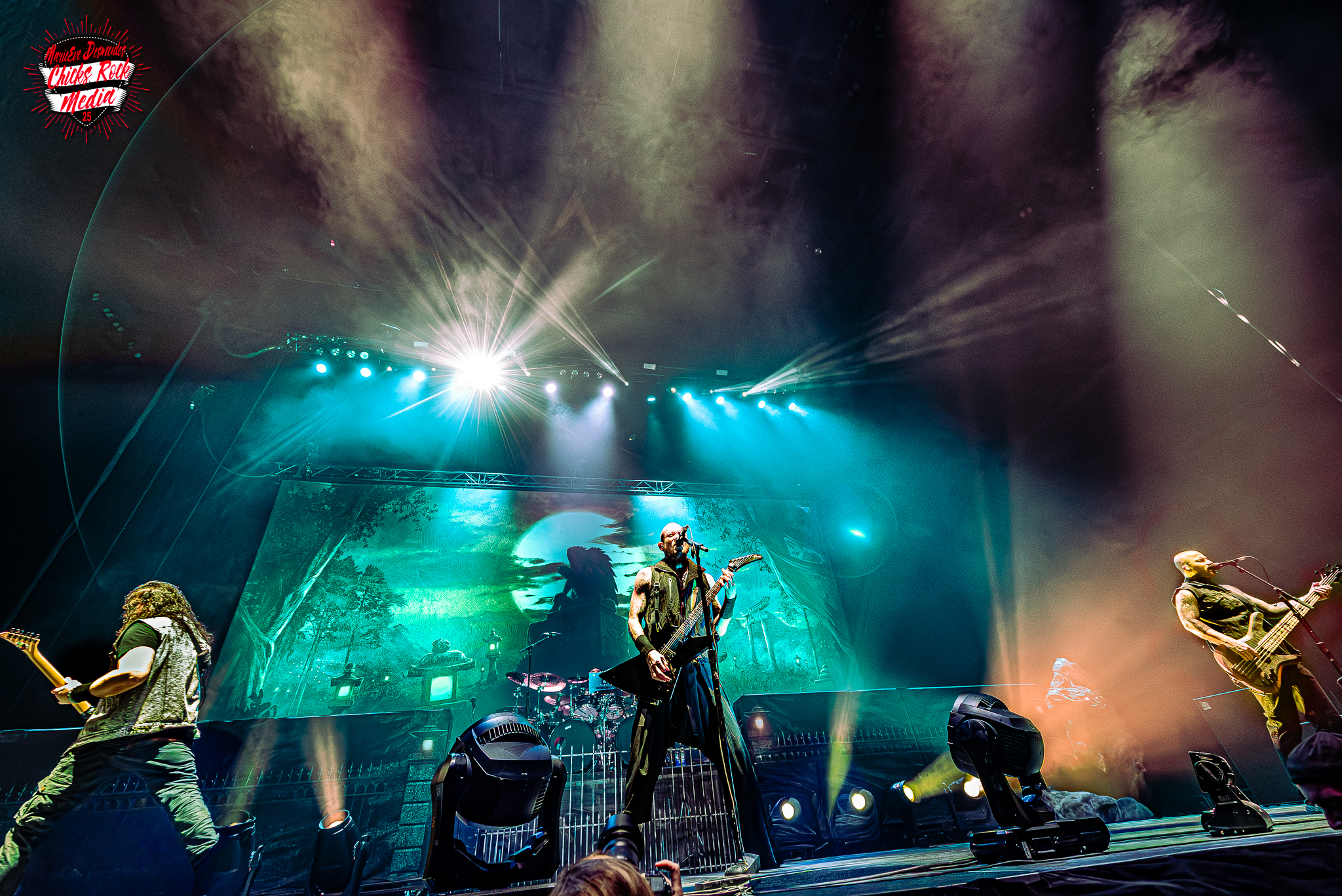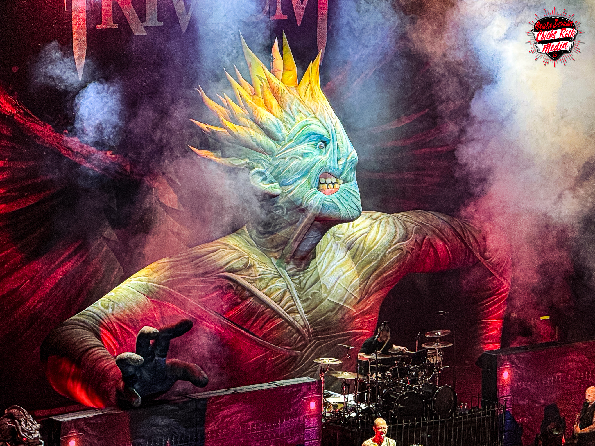 A Gunshot To The Head Of Trepidation came with projections of the shape of a monster’s head over the stage and backdrop. Not-so-subtle foreshadowing for what was to come, because at the midpoint of the song, a huge inflatable creature sprang to life behind the drum kit: Monte The Monster, the creature that Heafy himself had drawn back in 2004 for the cover of the Ascendency record. It had been a long time since I’d seen a band use a mascot this way, either as a costume, an animatronic or a pneumatic. I loved every second of Monte’s creepy presence on stage. It felt like seeing IRON MAIDEN’s Eddie all over again. Pristine old-school vibes.