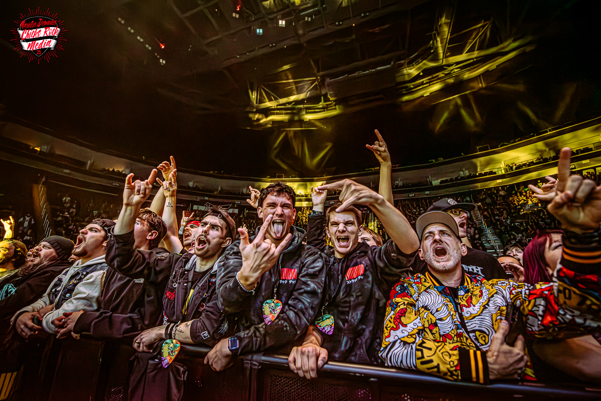 By 9:40, everyone’d made it to the arena, a solid 3k attendees I estimate. It was time for the pièce de résistance: the Americans of TRIVIUM. A group like this did not need an introduction. Formed in Florida in 1999 with a packed discography ten albums strong trailed by countless EPs and singles, the quartet had nothing to prove. They had their sound, their thing, their cult following; TRIVIUM was a well established, well respected name in the scene. Their three-way mix of metalcore, melodeath and thrash metal, as the name suggests, had its diehard fans. And diehard fans, we saw in droves. The crowd amassed in the Videotron Center was a masterclass in loyalty and dedication. Silver-haired veterans of the scene, the 30 to 40 millennial crew, parents with their kids or young teens there to pass the torch: this was a slew of devoted faithfuls who’d likely followed the band for over two decades and knew it inside out, coming to church together.